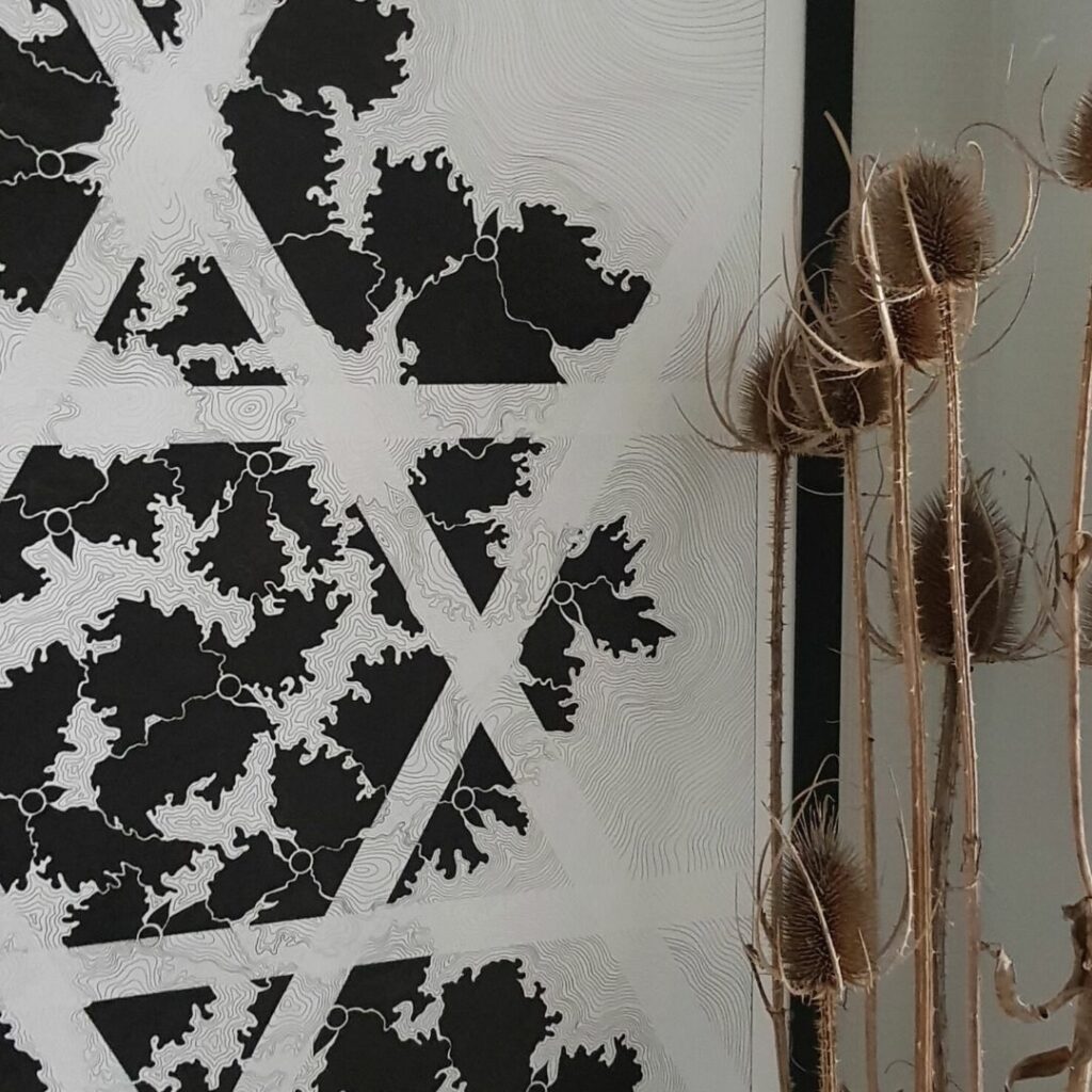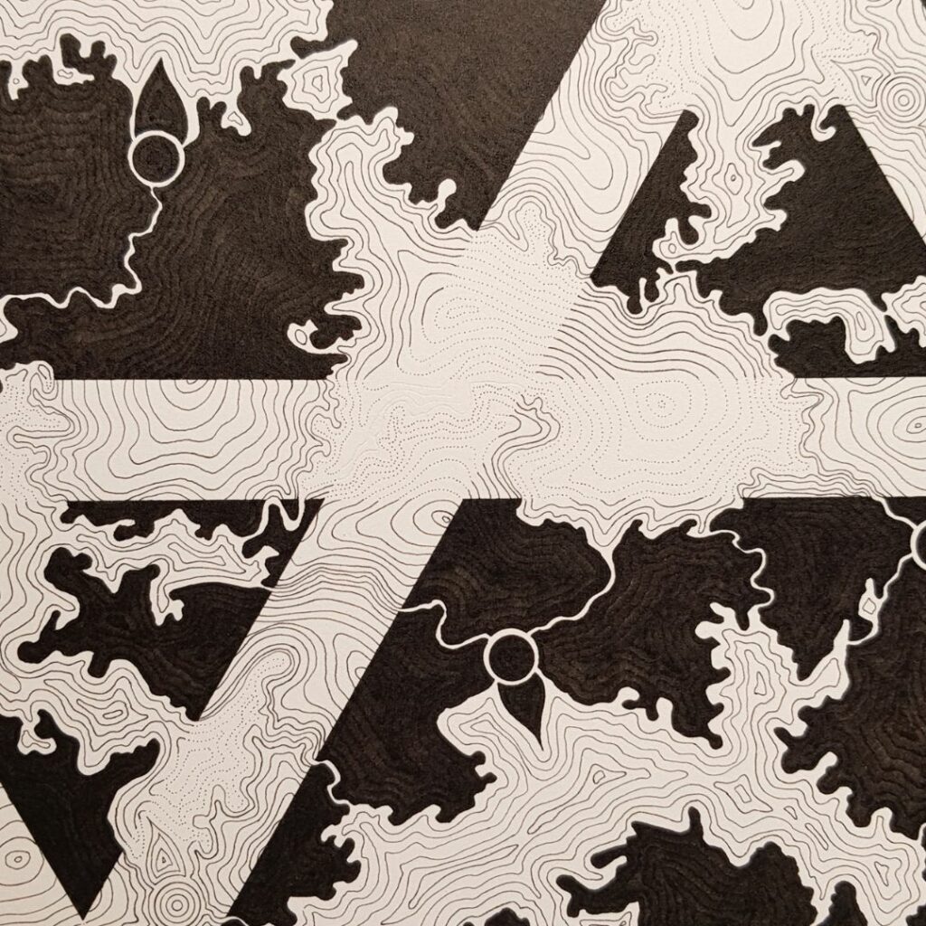 Les strates d’encre de Chine sont déposées dans la patience méditative du geste répété à l’infini, réminiscence de la Vastitude qui nous occupe tous et toutes, un jour ou l’autre…