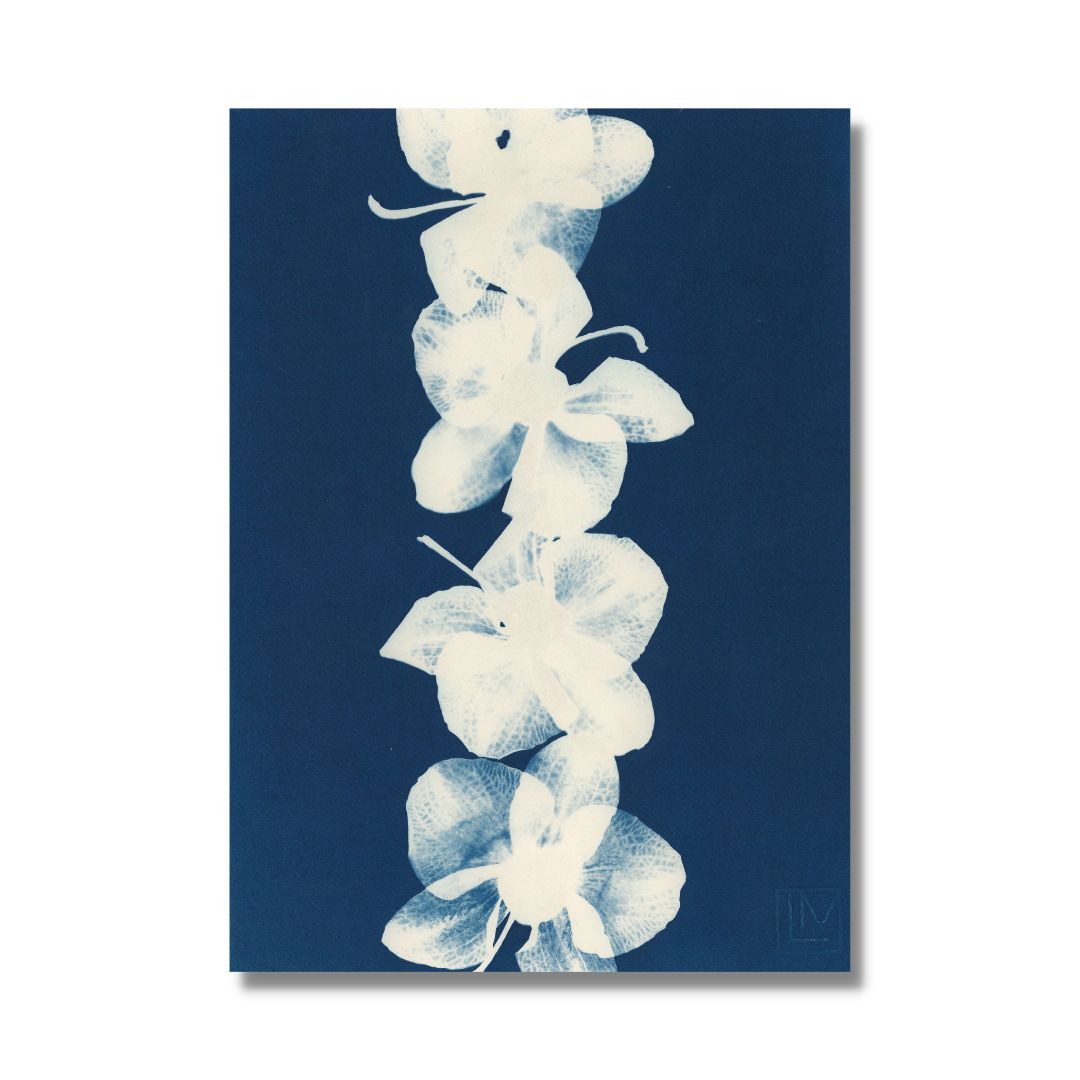 Cyanotype végétal de fleurs d’orchidées séchées