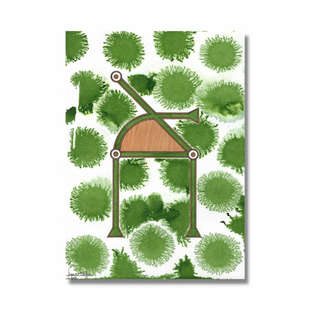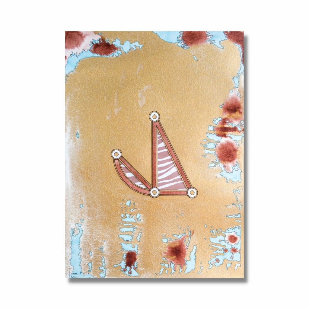 Tiré de mes explorations spirituelles, l’alphabet angélique que je mobilise était utilisé au XVIème siècle par les alchimistes pour dissimuler le contenu de leurs recherches. Dépassant l’obscurantisme de ces souvenirs mystiques, j’alchimise à mon tour les lettres géométriques en glyphes plastiques, jouant des formes, couleurs et textures pour produire des transcriptions riches et stimulantes, non dénuées d’humour, des sujets qui me touchent au quotidien.
