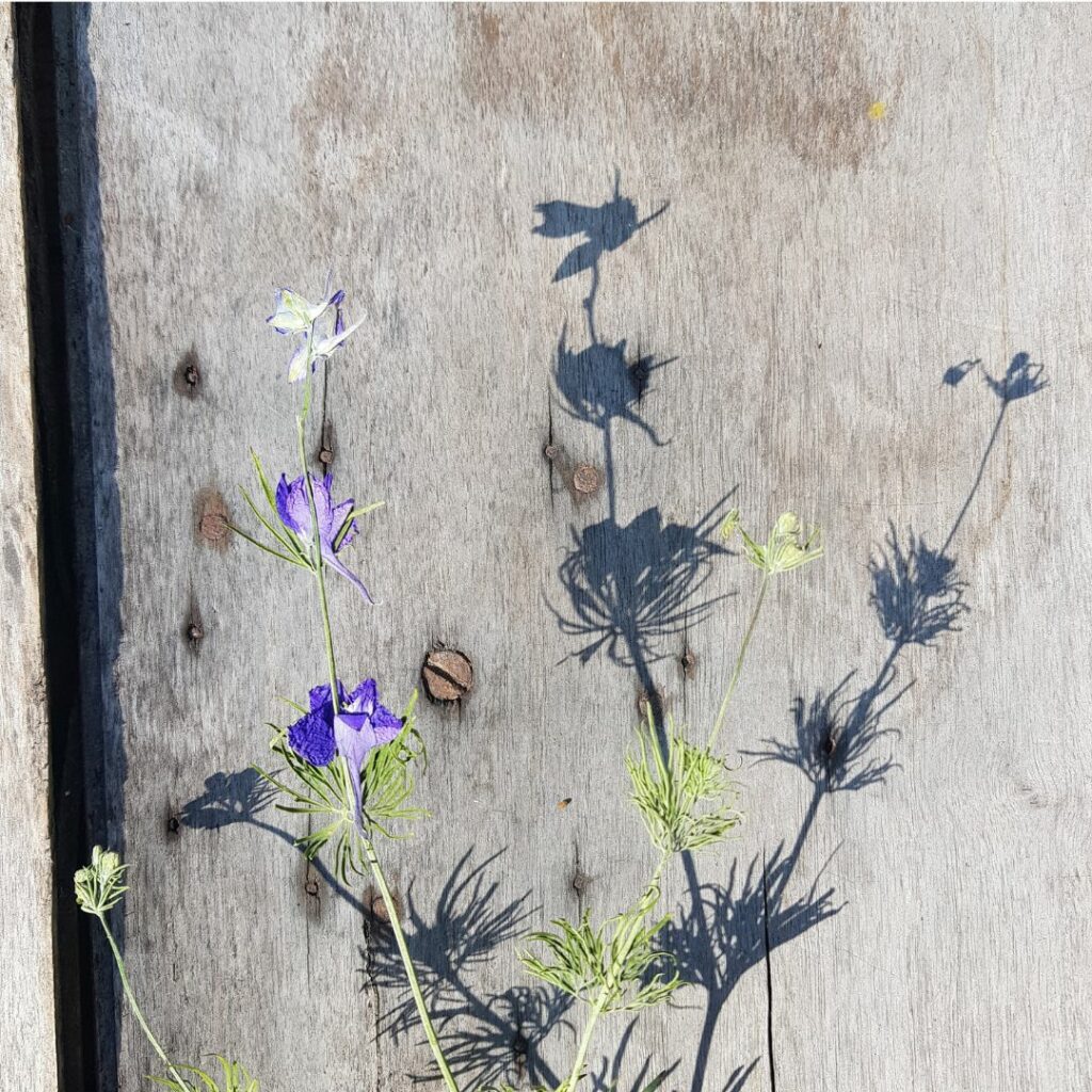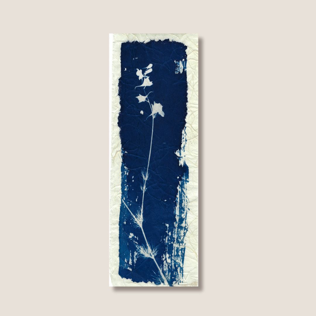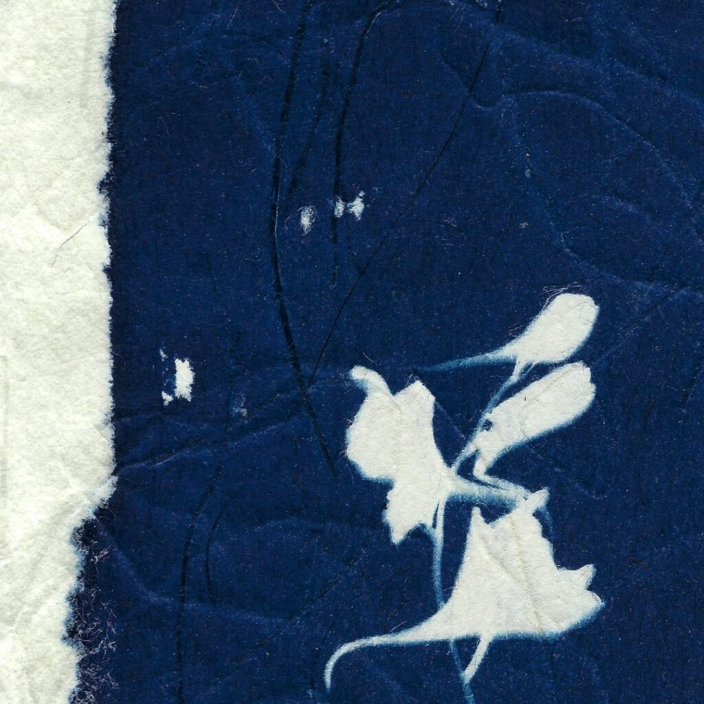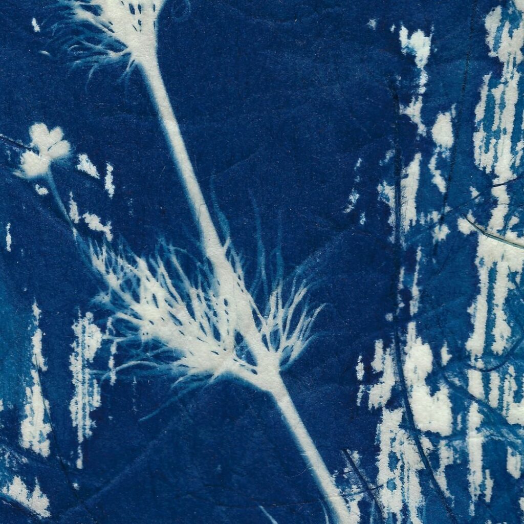 Sur ce cyanotype réalisé au printemps 2023, l’œil se perd entre le dessin des feuilles finement découpées et les fibres du papier crème.