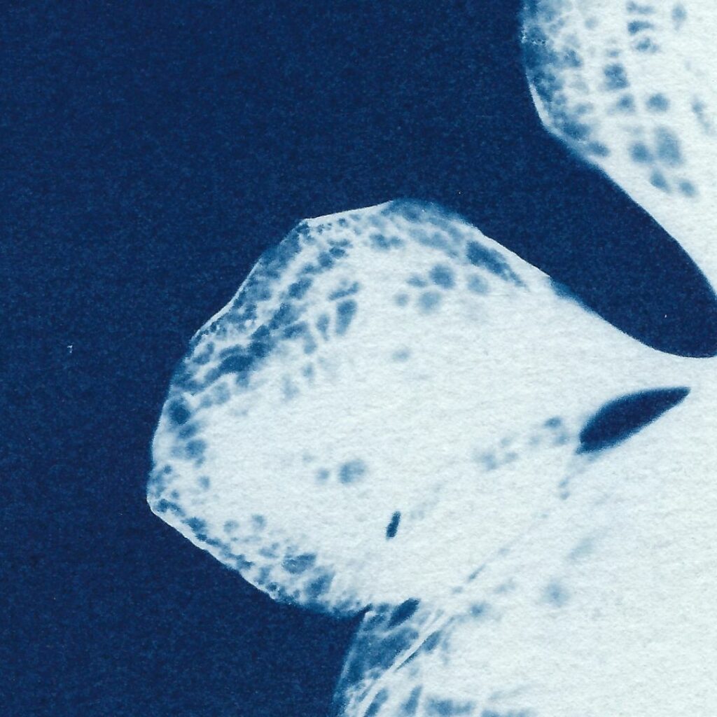 Remontant le temps pour me connecter à ce XIXème siècle bouillonnant qui m’est cher, j’exploite le procédé du cyanotype à la manière d’Anna Atkins (1799-1871). Dans mes œuvres, la plante, née une première fois de la lumière, se révèle à nouveau dans la confidence de ses détails, grâce au contraste poussé à l’extrême par la saturation des sels de fer. Ces cyanotypes végétaux, à la fois puissants et intimes, nous rappellent l’essence de notre vitalité, notre propre origine lumineuse.
