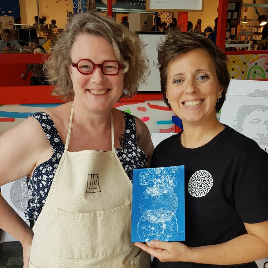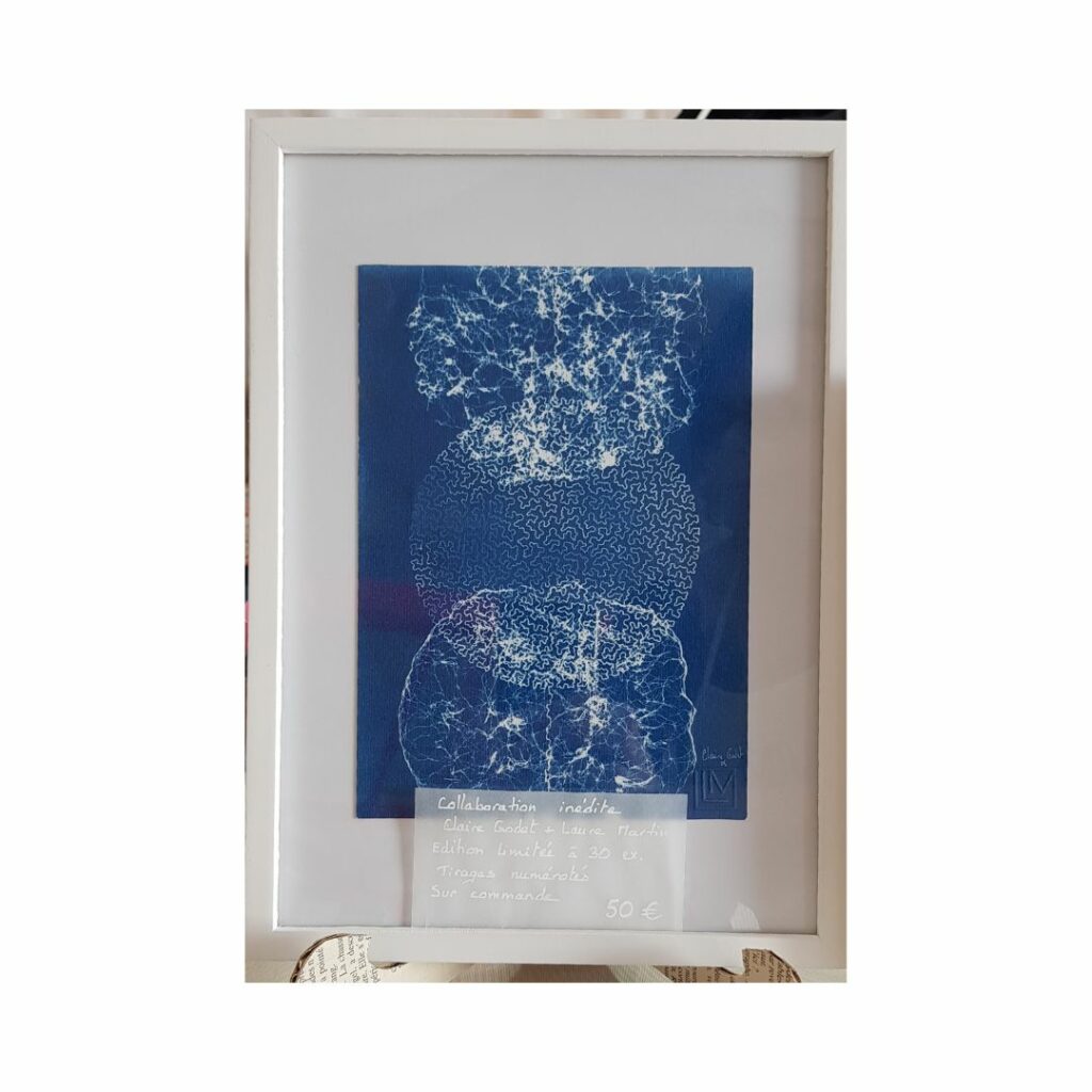 Elle ne connaissait pas le procédé du cyanotype, alors je lui ai tendu une feuille de calque pour qu’elle y trace sa ligne signature. Elle est revenue vers mon stand, un cercle labyrinthique était apparu au feutre noir sur le papier transparent.