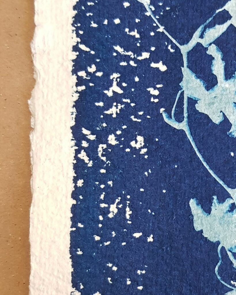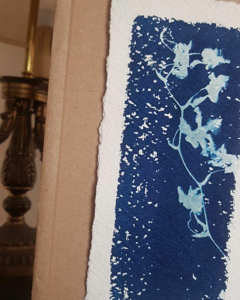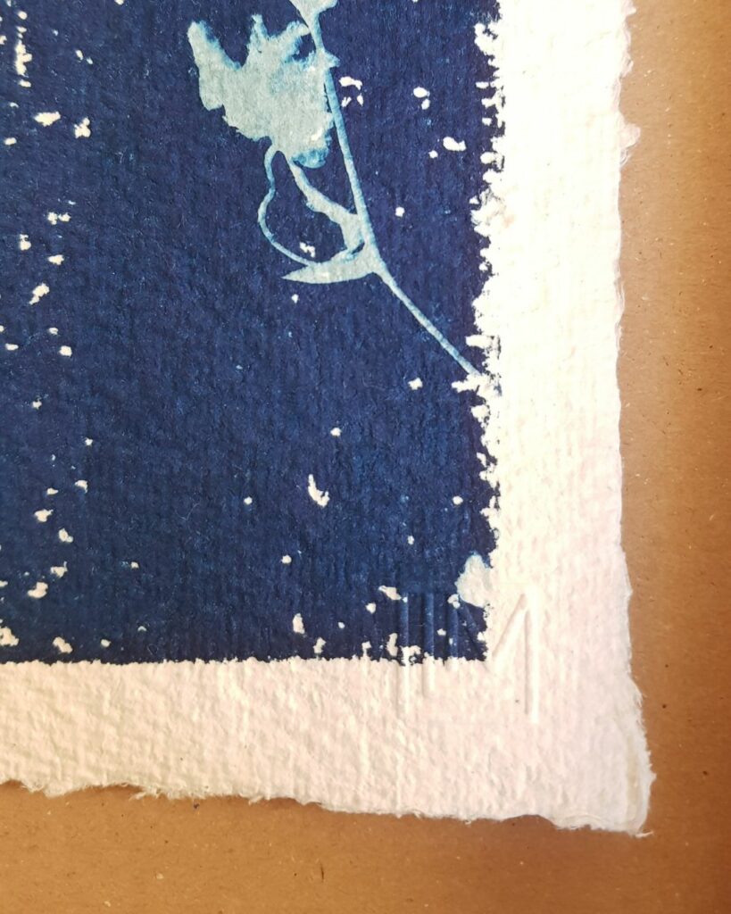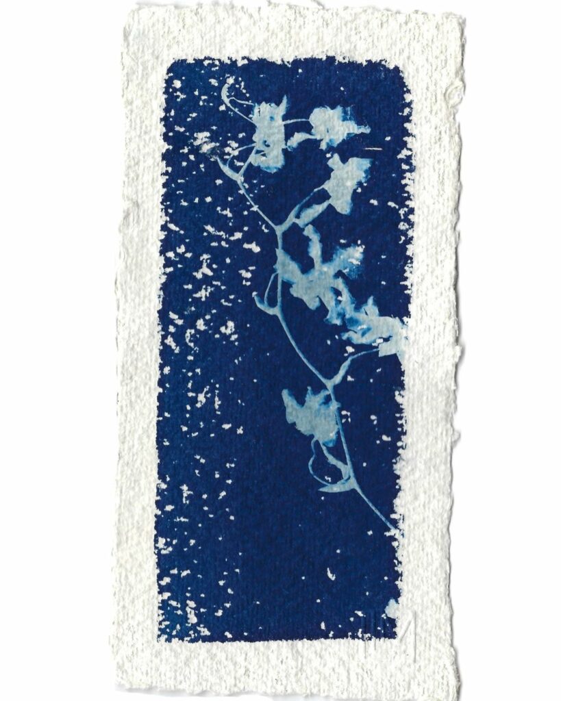 Aussitôt j’ai imaginé le rendu d’un tirage floral au cyanotype, la façon dont la fibre du papier laisserait des blancs dans le bleu, un effet de neige, de flou, de rugueux…
