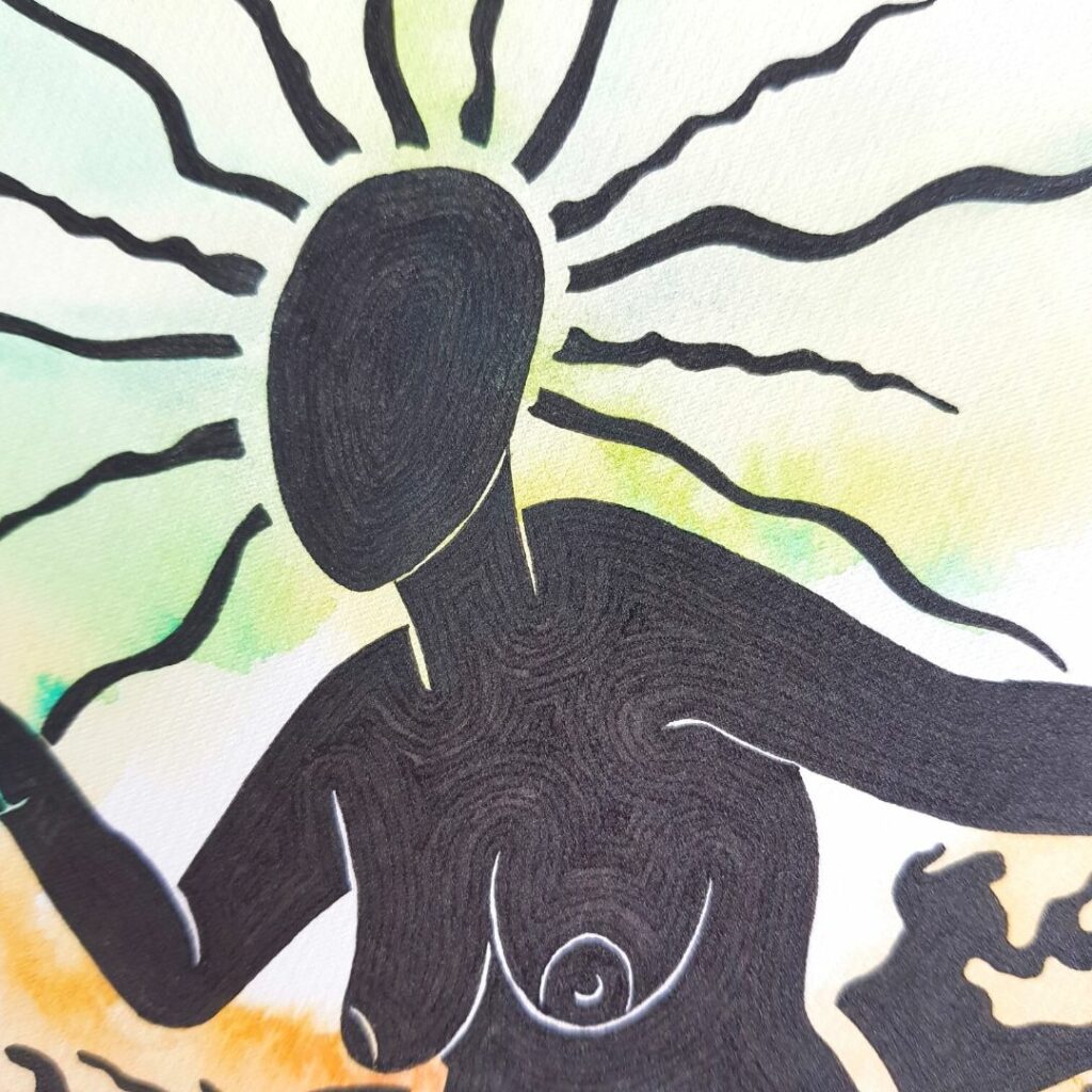 Comme une évocation totémique du corps féminin en transformation, la Wild Mama fait face, embrasse et avance, nous renvoyant ainsi au cheminement interne que chacune d’entre nous effectue au quotidien, tout au long de sa vie.