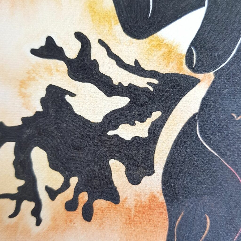 Cette Wild Mama est la mère de toutes les autres.Première née d’une longue série d’autoportraits, elle en porte l’essence.L’encre de Chine est déposée au stylo tubulaire, dans un mouvement spiralé qui épouse les contours pour rejoindre le centre.